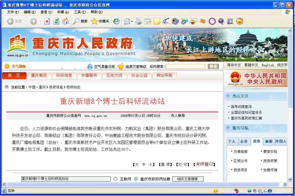 根据重庆市人民政府网报道,经专家评议,国家人力资源和社会保障部(人社部发[2008]43号)于2008年6月19日批准122cc太阳集成游戏科技开发总公司等345个单位设立企业博士后科研工作站,开展废油资源化技术、环保及相关学科领域等的博士后培养工作。