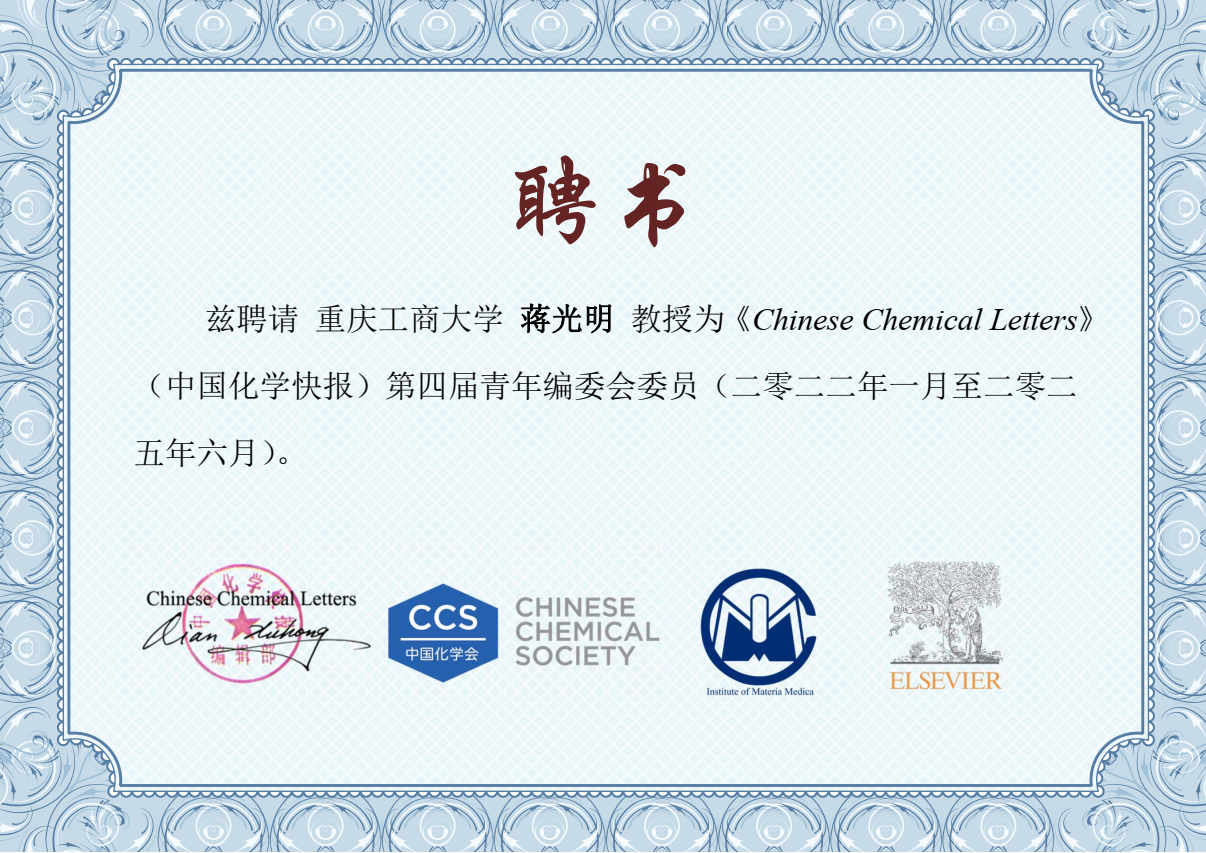 近期,122cc太阳集成游戏废油资源化技术与装备教育部工程研究中心蒋光明研究员被SCI期刊《Chinese Chemical Letters》聘为青年编委会委员,聘期为3年(2022.01-2025.06)。