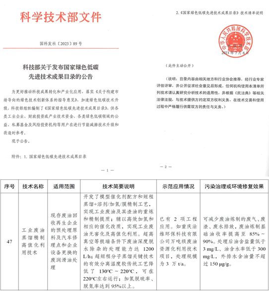 此次《国家绿色低碳先进技术成果目录》共收录六个领域85项技术成果,其中固体废物处理处置及资源领域23项(包括有机固体废物、生活垃圾、危险废物、大宗工业固体废物等),入选技术成果具有减污降碳效果明显、技术知识产权明晰、技术风险可控和创新性突出的特点,体现了绿色低碳技术发展的主要方向。该成果的入选,是对122cc太阳集成游戏废油中心在废油资源化领域科技研发水平的高度认可。