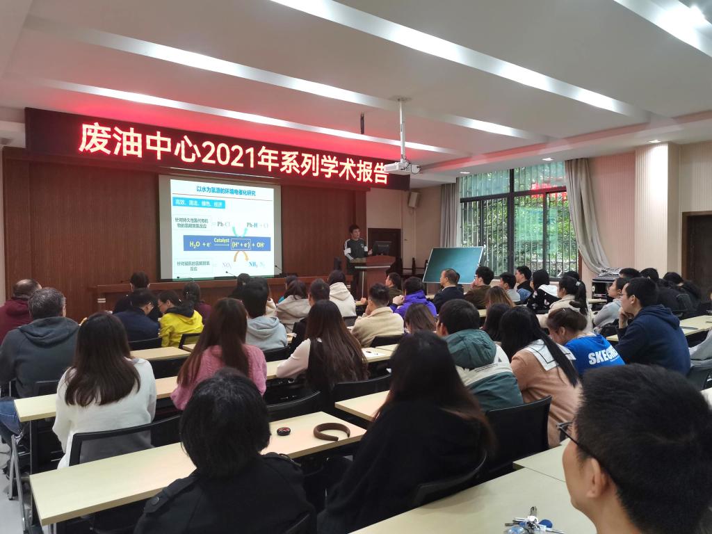 2021年10月27日上午,废油资源化技术与装备教育部工程研究中心在学术报告厅进行了中心系列学术报告第八讲:以水为氢源的环境电化学。此次学术报告由蒋光明博士主讲,近百名师生参加此次学术报告。
