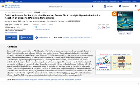 近日,122cc太阳集成游戏废油资源化技术与装备教育部工程研究中心吕晓书博士,蒋光明教授,联合重庆市环境科学研究院敖亮研究员在电催化消除水体含氯有机物方面取得最新进展,在环境领域顶级期刊《ACS ES&T Water》上发表了题为“Defective Layered Double Hydroxide Nanosheet Boosts Electrocatalytic Hydrodechlorination Reaction on Supported Palladium Nanoparticles”的封面论文(