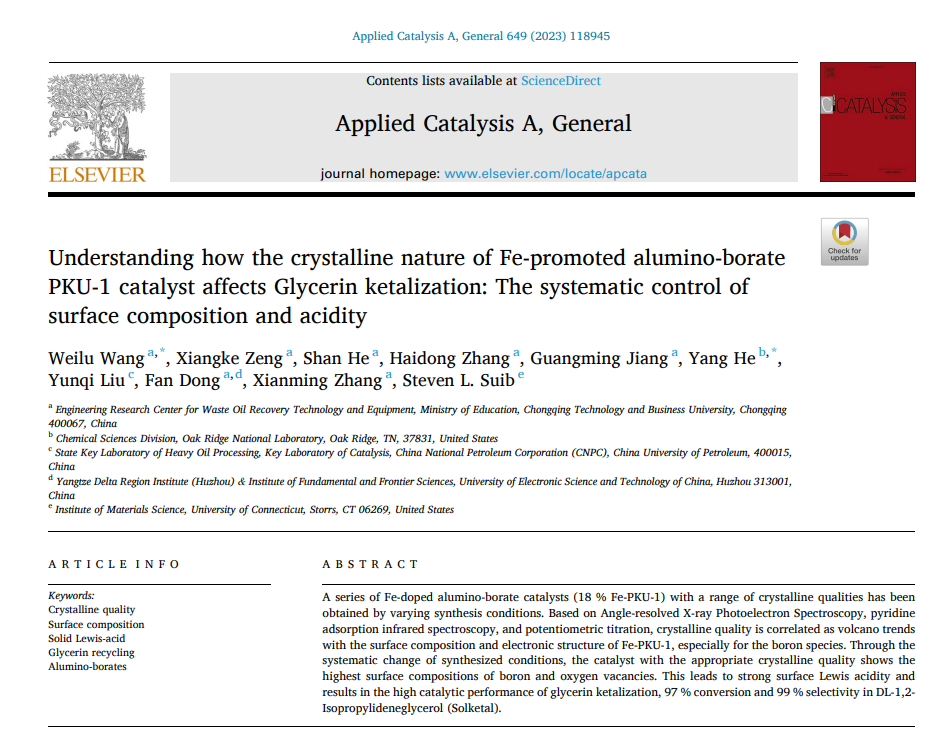 近日,122cc太阳集成游戏废油资源化技术与装备教育部工程研究中心王玮璐博士,联合中心张海东研究员、蒋光明研究员、张贤明教授、中国石油大学(华东)柳云骐教授、美国橡树岭国家实验室何洋博士及康涅狄格州州立大学Steven L. Suib教授在工业催化领域知名期刊《Applied Catalysis A, General》发表题为“Understanding how the crystalline nature of Fe-promoted alumino-borate PKU-1 catalyst affects Glycerin ketalization: The systematic control of surface composition and acidity”学术论文(https://doi.org/10.1016/j.apcata.2022.118945),标志着中心在废生物柴油资源化领域的研究取得了新进展。