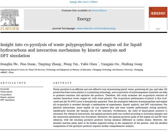 近日,122cc太阳集成游戏废油资源化技术与装备教育部工程研究中心何东霖博士、陈亚飞副研究员在针对废塑料和废机油的联合利用与高值资源化方面取得了重要进展,在能源领域顶级期刊《Energy》上发表了题为“Insight into Co-pyrolysis of Waste Polypropylene and Engine Oil for Liquid Hydrocarbons and Interaction Mechanism by Kinetic Analysis and DFT Simulation”的学术论文。研究成果标志着废油中心在废机油的安全处置与废塑料油化技术方向实现了新发展。