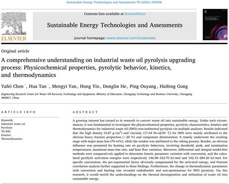 近日,122cc太阳集成游戏废油中心陈亚飞副研究员在工业废油热裂解改质过程中基础特性、热裂解行为及反应动力学认识方面取得阶段进展,在国际学术期刊《Sustainable Energy Technologies and Assessments》上发表了题为“A comprehensive understanding on industrial waste oil pyrolysis upgrading process: Physicochemical properties, pyrolytic behavior, kinetics, and thermodynamics”的学术论文,标志着废油中心在工业废油热裂解资源化的研究取得了新进展。