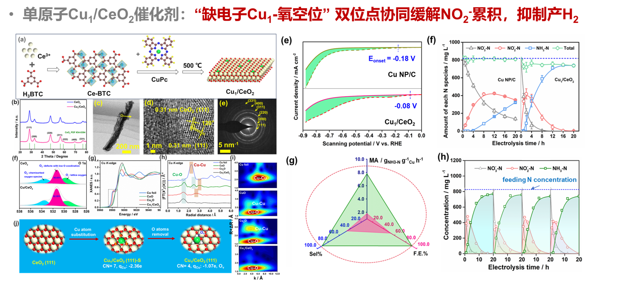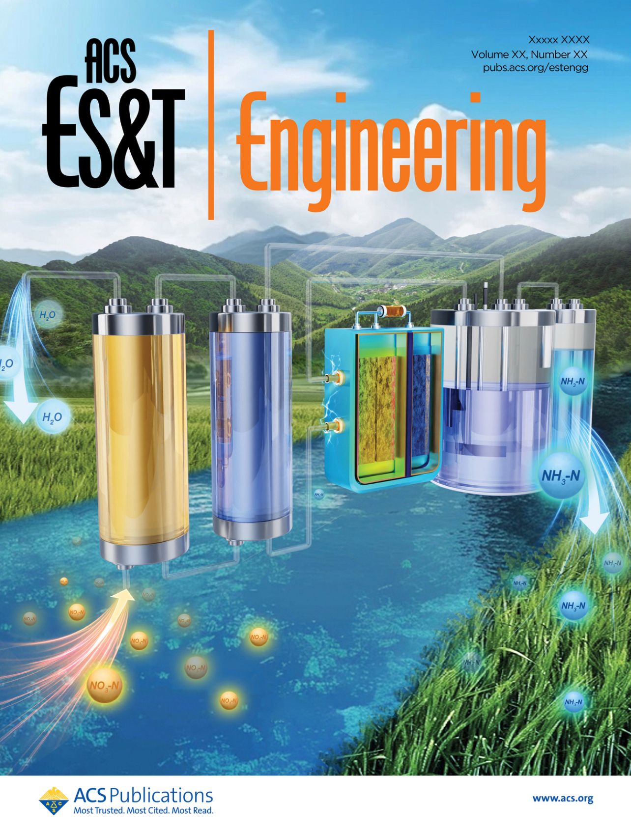 进展二:开发了一套包含“离子交换装置—树脂再生装置—电化学转化器—超声强化汽提装置”四个单元的一体化反应系统装备,可同时实现硝氮污染控制和氮资源循环利用的目标,可适用于缺乏电解质的自然水体或含结垢离子的工业污染水体修复。开发了铜基单原子催化剂(Cu1/CeO2),在原子水平上阐明了反应路径和决速步骤,提出了“缺电子Cu1-氧空位”双位点协同反应机制,解决了当前铜基催化剂反应速率慢,电流效率不高的问题。相关成果以封面论文形式发表于ACS ES&T Engineering 2024, https://doi.org/10.1021/acsestengg.4c00299 .