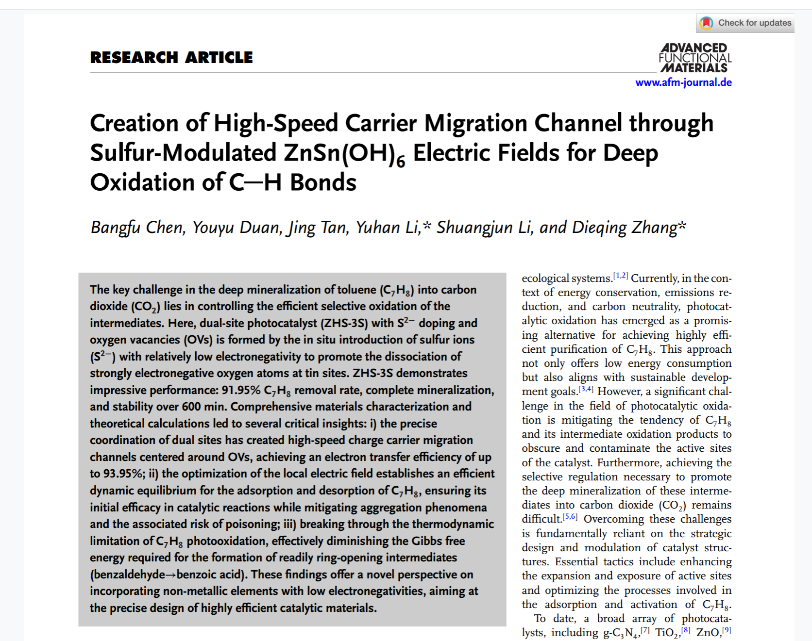 近日,122cc太阳集成游戏废油资源化技术与装备教育部工程研究中心李宇涵研究员团队在有机废气污染控制领域取得重要突破。针对工业生产、汽车尾气及汽油蒸发排放中产生的甲苯(C7H8)废气,该团队创新性提出“硫调控ZnSn(OH)6电场优化载流子迁移”策略,成功构建高速载流子迁移通道,促进C-H键的深度氧化进而实现了C7H8的高效去除。相关研究成果以题为(Creation of High-Speed Carrier Migration Channel through Sulfur-Modulated ZnSn(OH)6 Electric Fields for Deep Oxidation of C-H Bonds)发表于材料科学领域顶级期刊《Advanced Functional Materials》(影响因子18.5)。